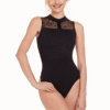 The mix of materials makes this leotard a modern choice with gorgeous detailing including a V-back lace panel and front zip opening