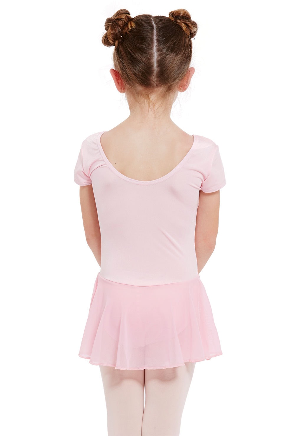 Girls cap sleeve shiny lycra leotard with semi-opaque power mesh skirt. 80% nylon 20% lycra elastane.