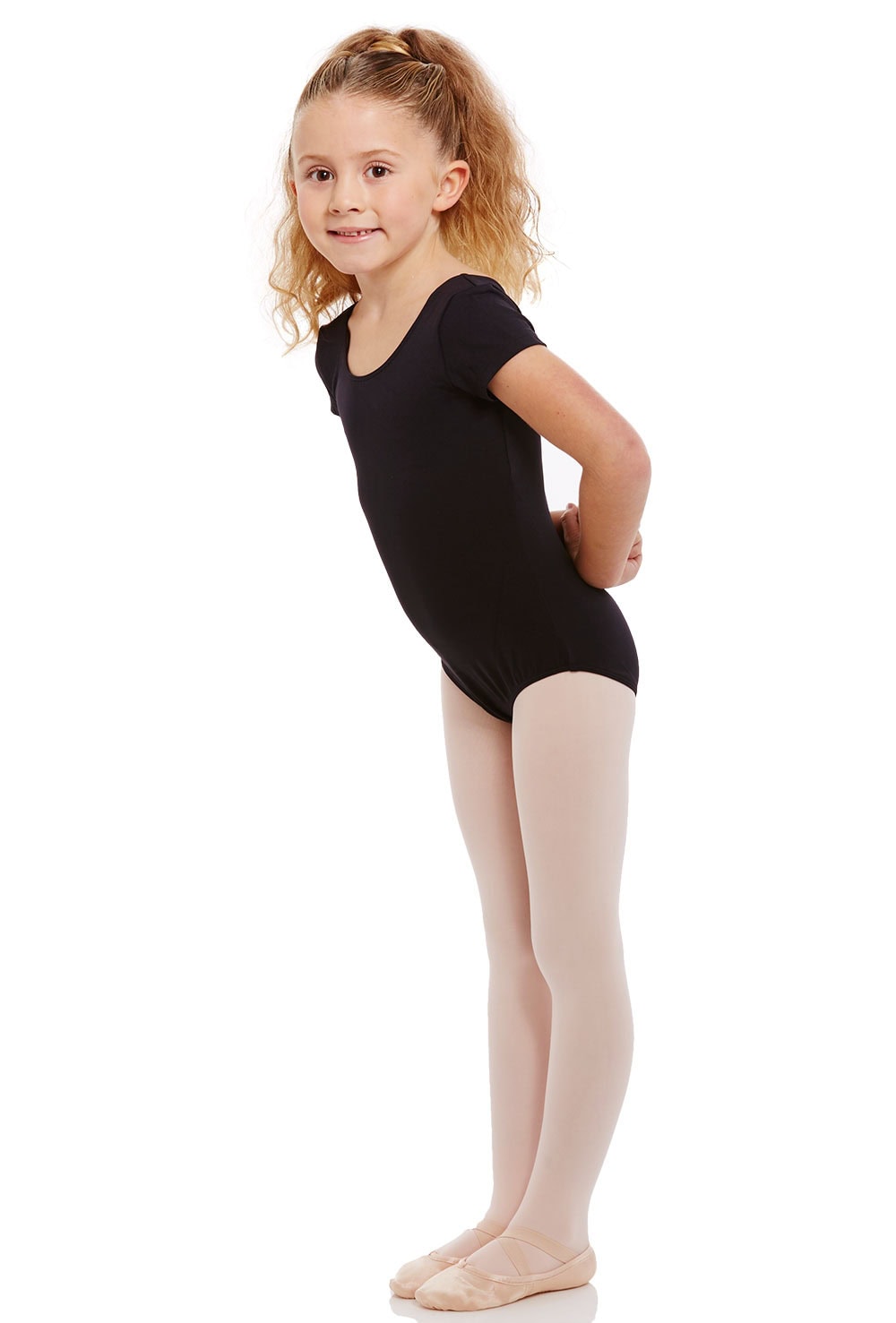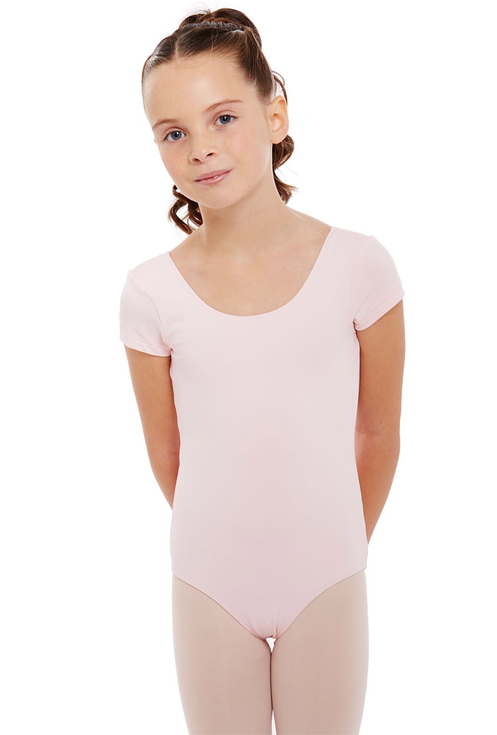 Girls basic and durable cap sleeve leotard with shallow scoop back. 90% nylon 10% spandex.