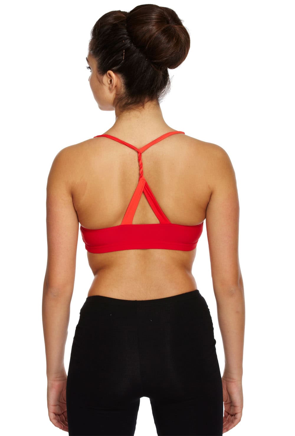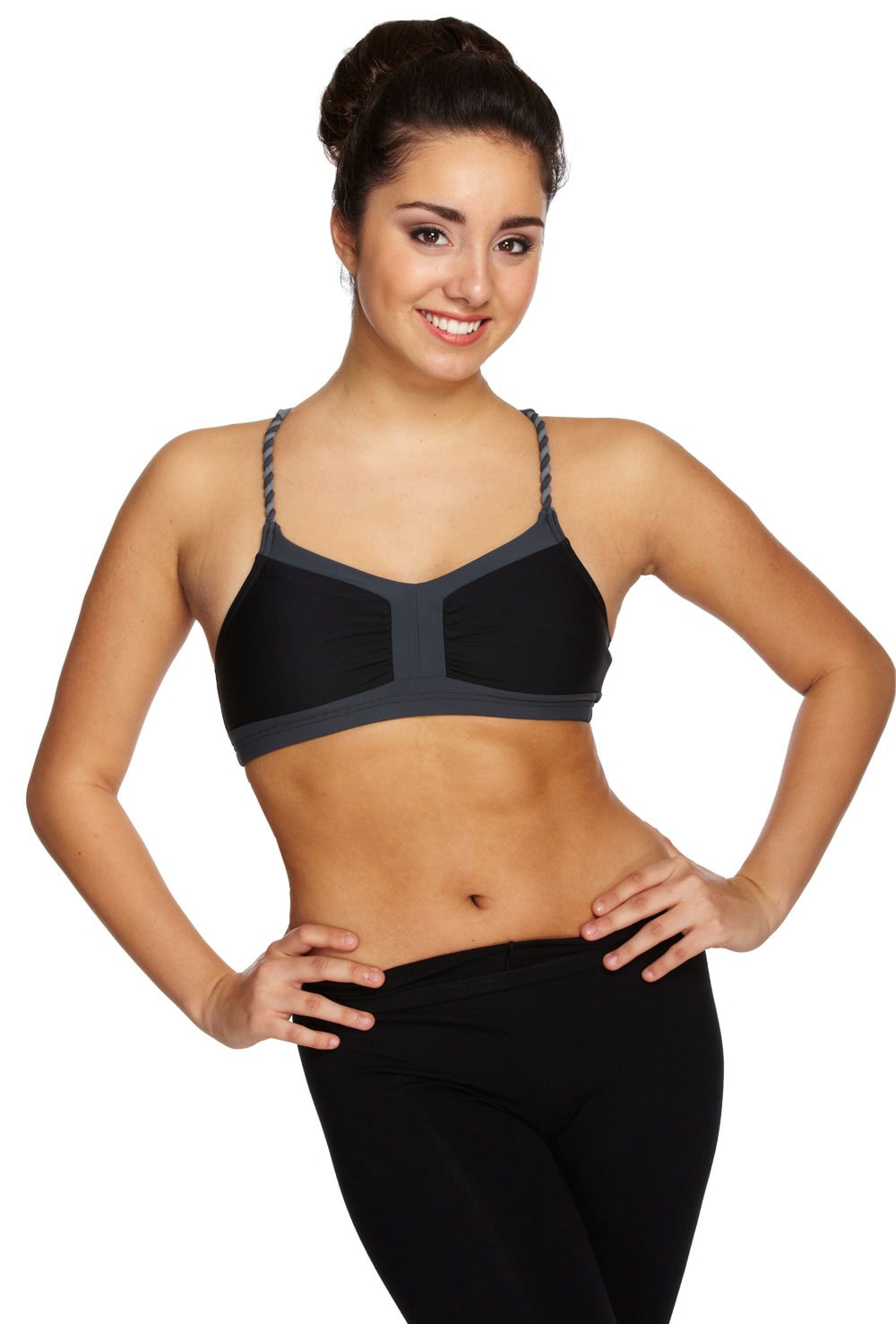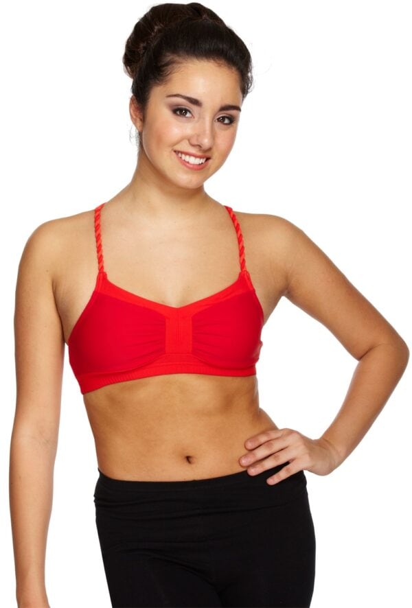 Camisole bra top with ruched bust, contrast trim and braided straps with intwined back detail. Features bra modesty lining. 80% nylon 20% spandex.