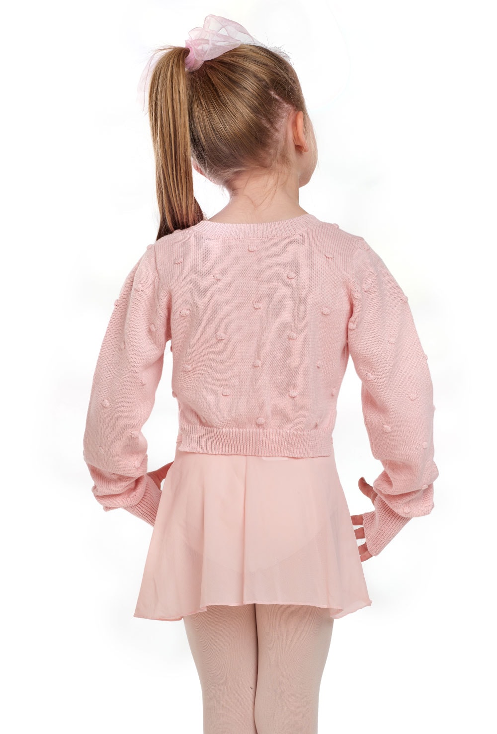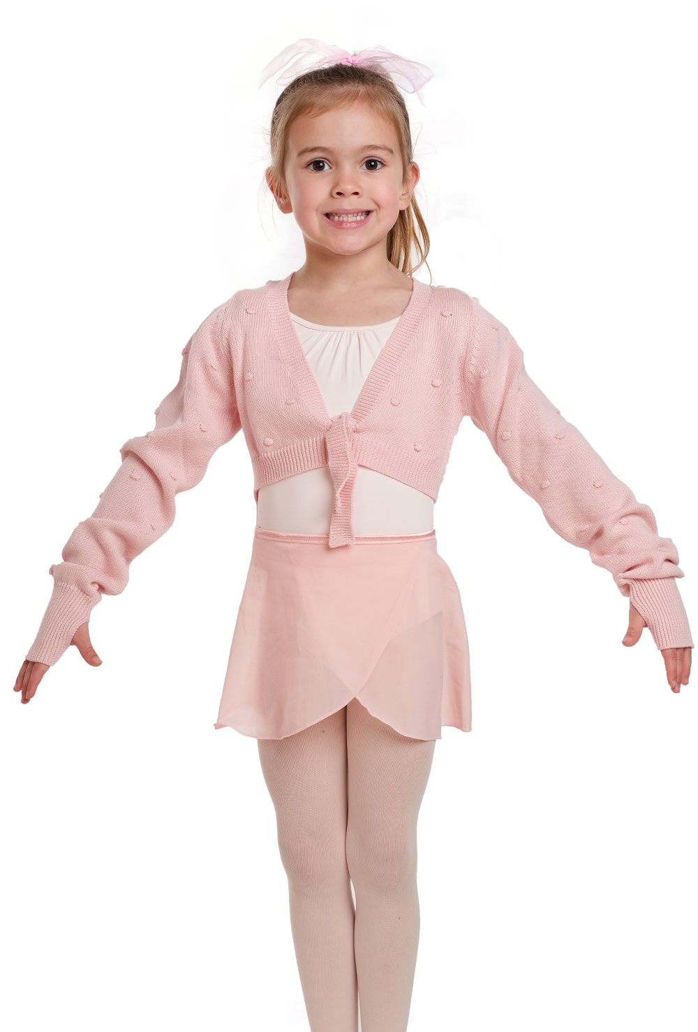 The bubble knit texture gives this cardigan a fun look and the built in fingerless gloves keeps little ballerinas extra warm