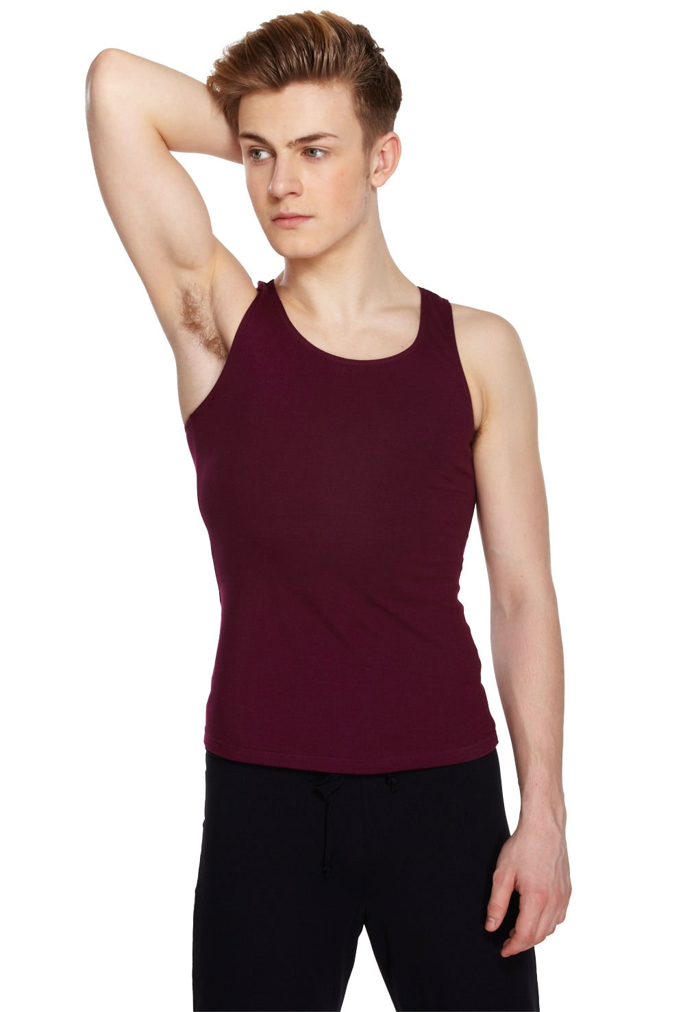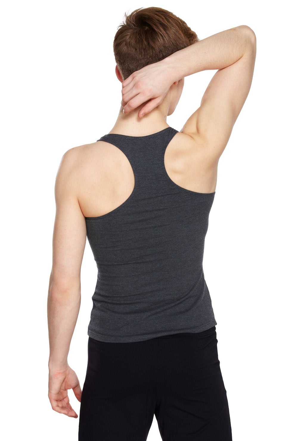 Male waist length tank style dance vest with contoured racer back. 90% cotton 10% elastane.