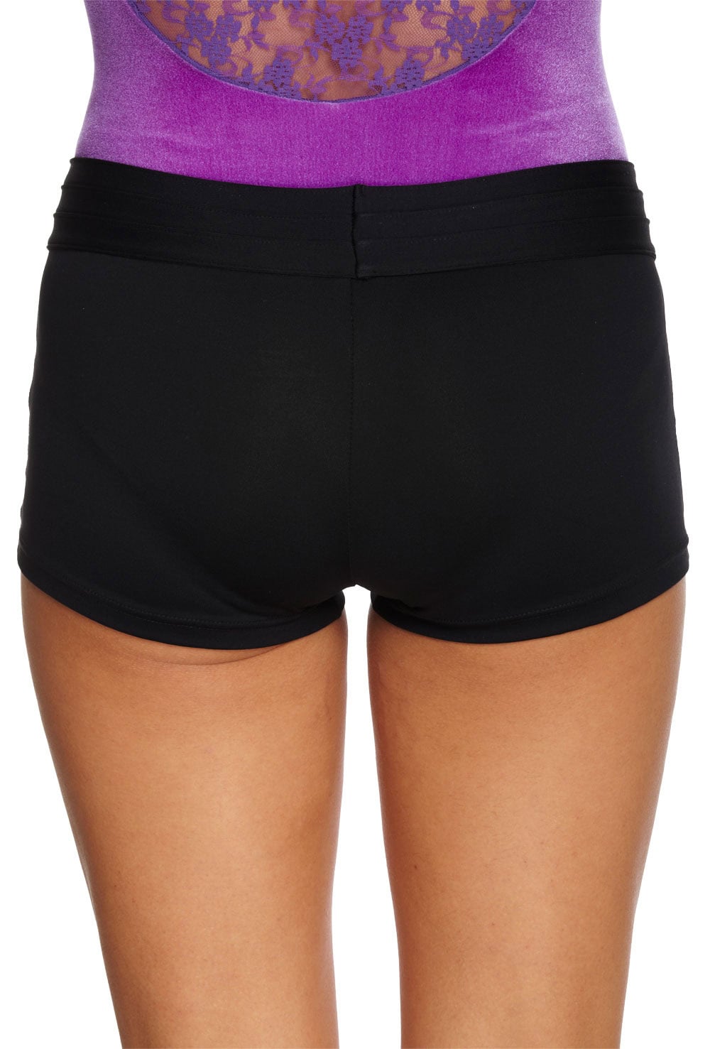 Hotpant shorts with triple chevron V-waistband with aperture detail. 88% nylon 12% spandex.
