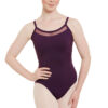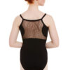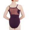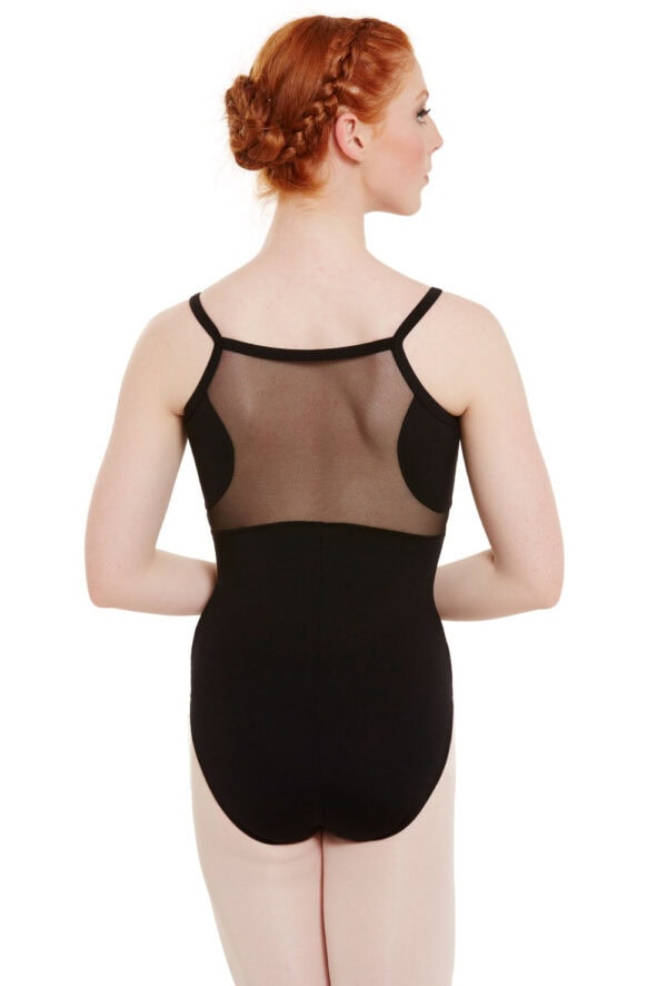 Camisole leotard with contoured mesh back panel and neck trim. Features bra modesty lining. 90% micro nylon 10% elastane.