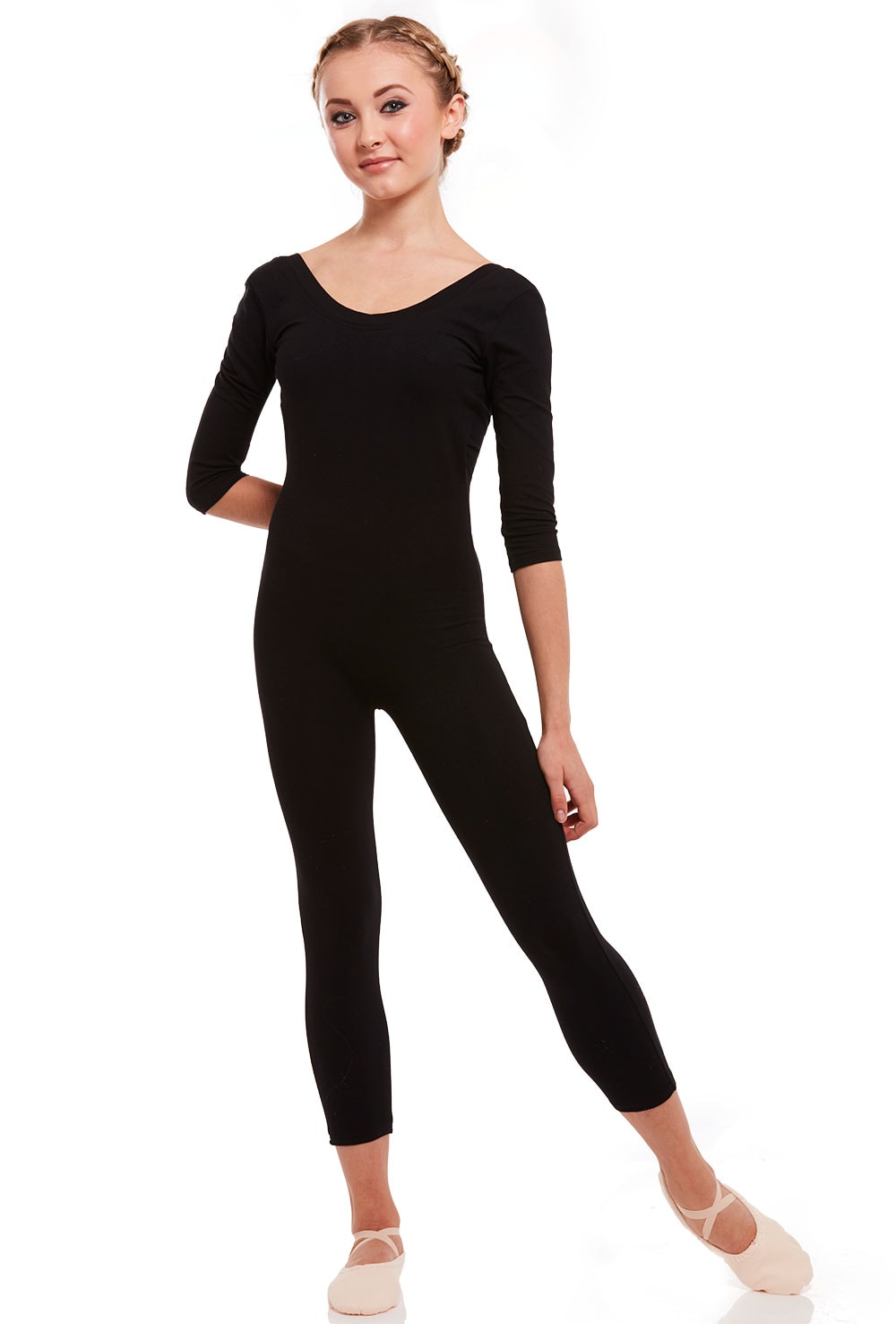 Cotton dance unitard with 3/4 length sleeves, cropped legs and deep scoop back. Features bra modesty lining. 90% cotton 10% spandex.