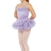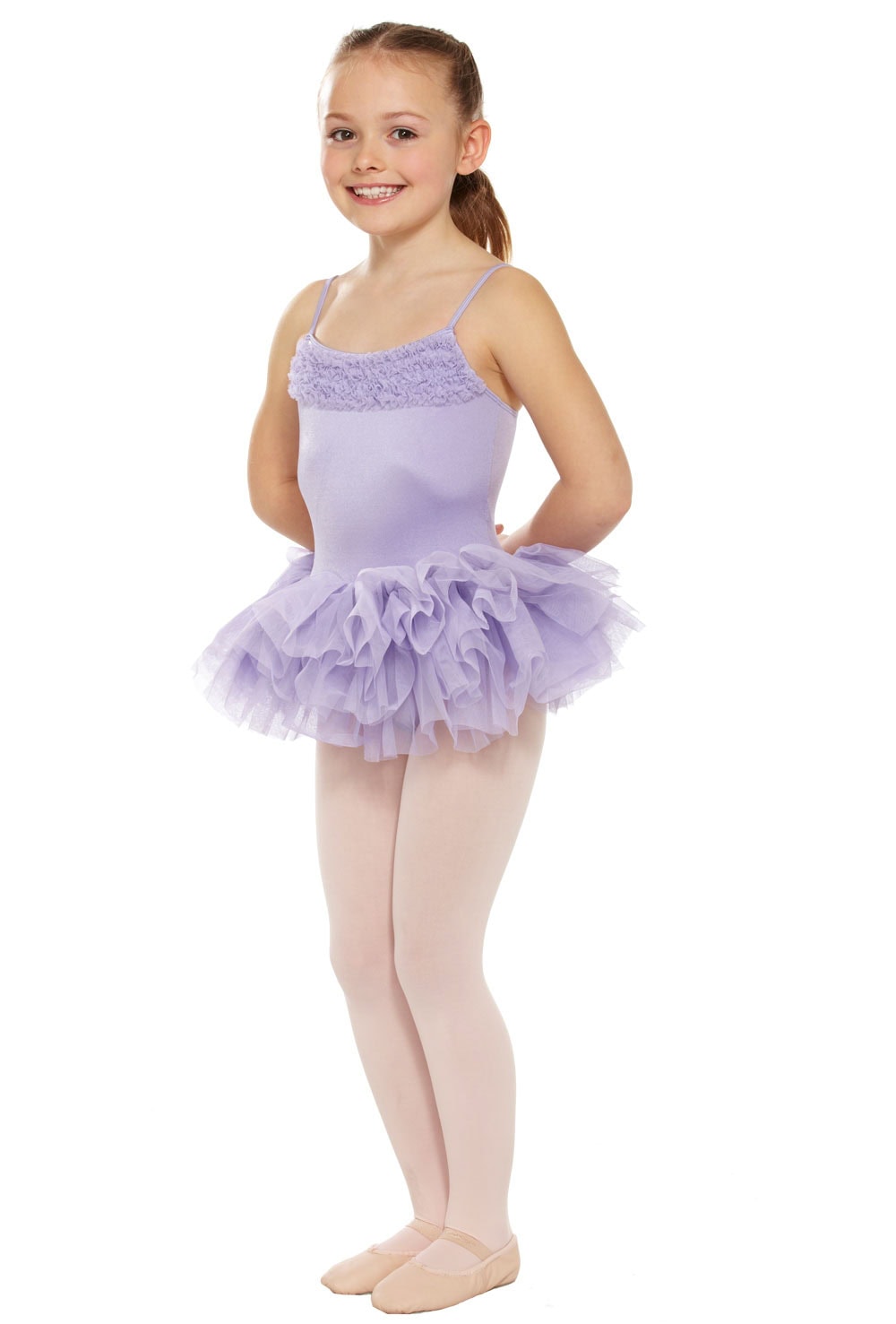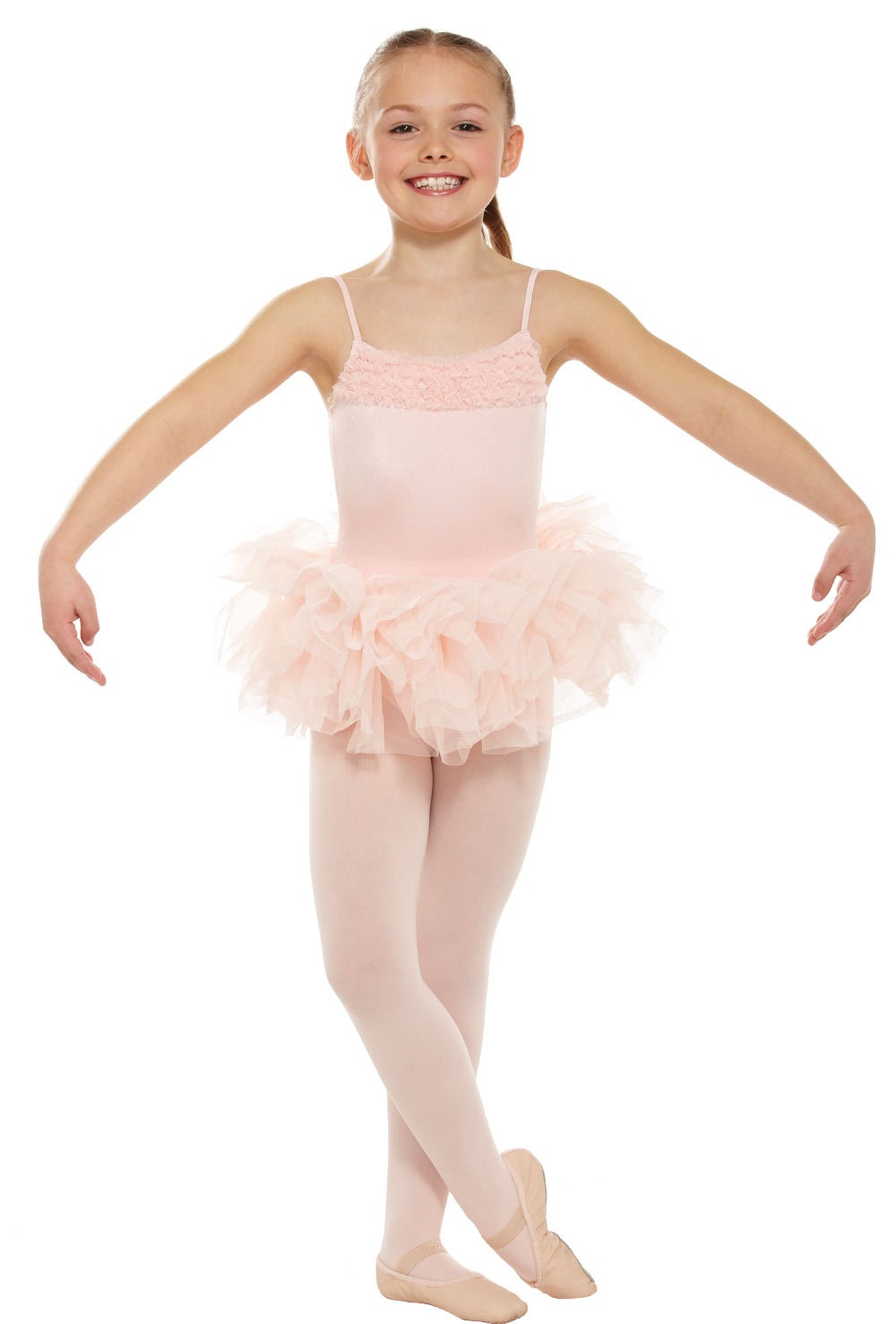 Bestselling camisole tutu with pretty tulle ruffle empire chest and graduated soft net skirt. Features full front modesty lining. 83% nylon 17% spandex.