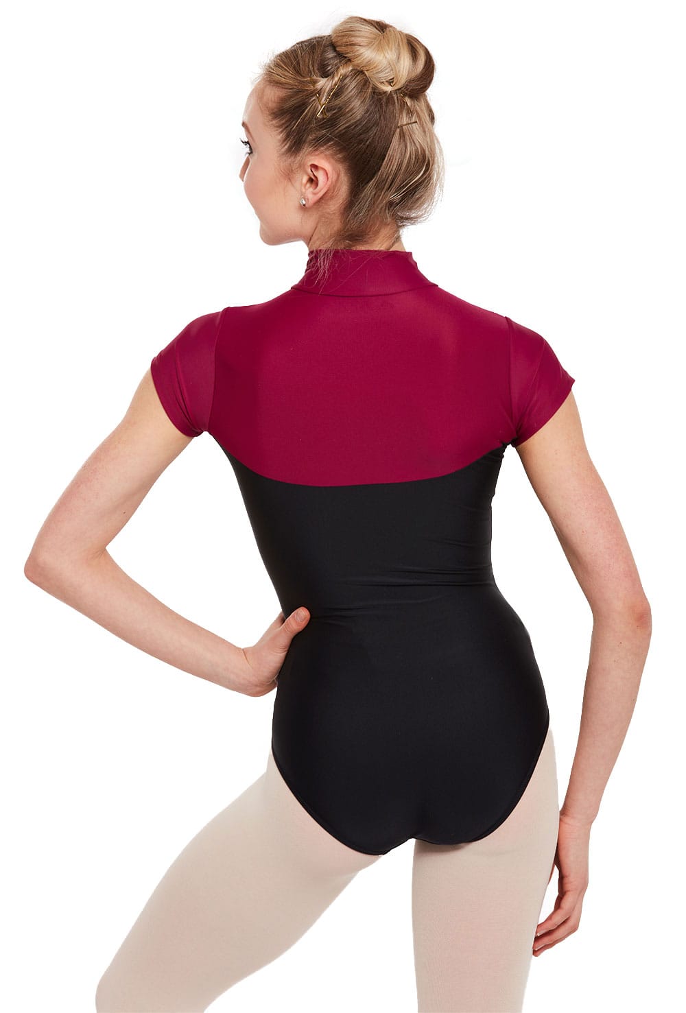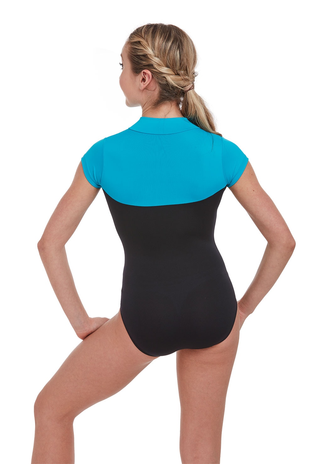 Sporty two-tone cap sleeve leotard with front zip