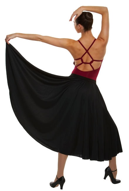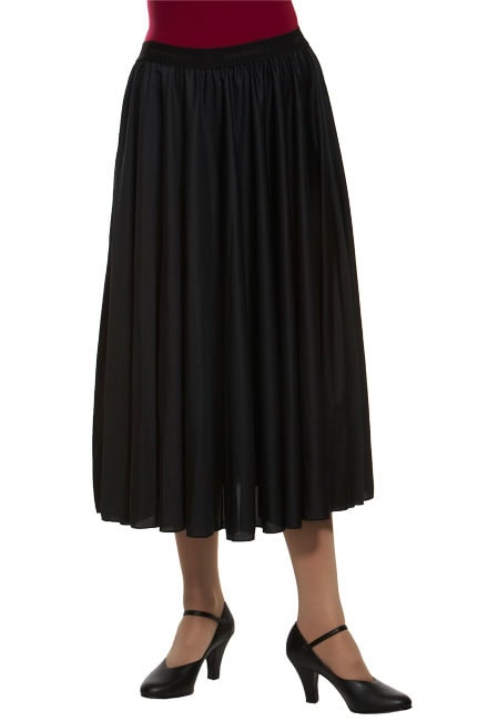 Beyond-full-circle lightweight skirt for ultra movement and flare. Features elastic pull-on waistband. Length x 30″/ Waist 28″-32″. 100% opaque and matte polyester.