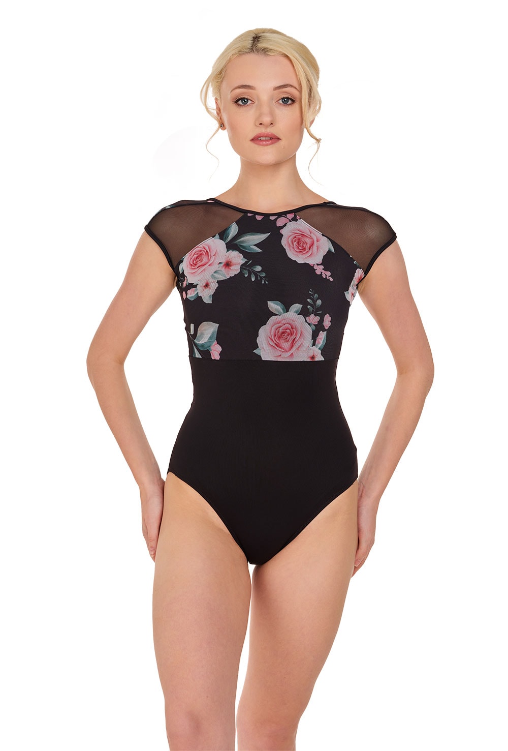 The bold floral prints in combination with solid sweet pear or black lower halves of these gorgeous cap sleeve leotards provides a beautiful yet harmonious contrast to lift your spirits