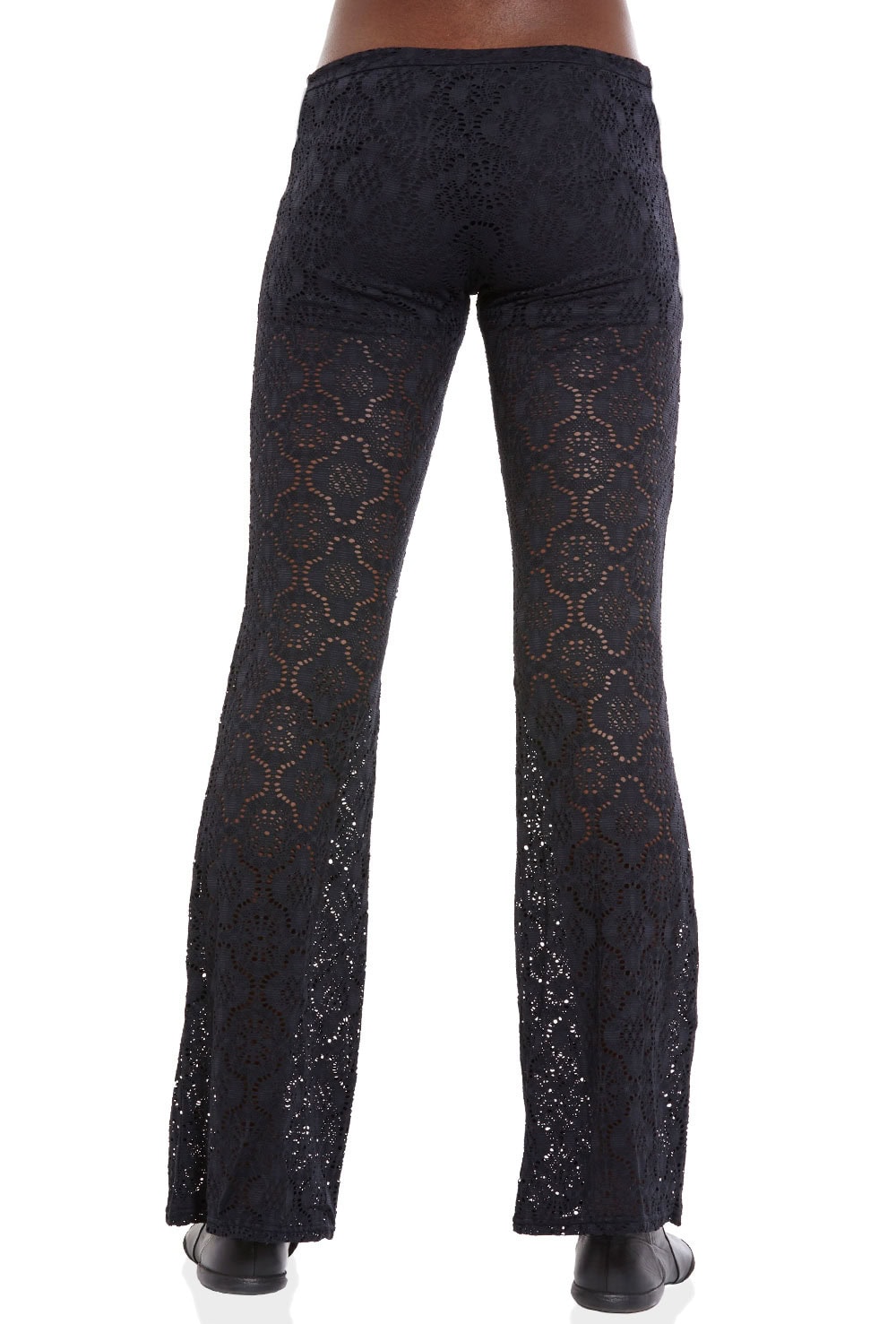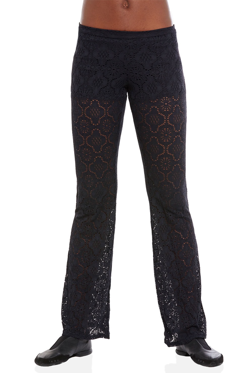Loose-fit semi-opaque lace jazz pants overlaid integral opaque hot pant shorts. 85% nylon 15% spandex.Loose-fit semi-opaque lace jazz pants overlaid integral hot pant shorts