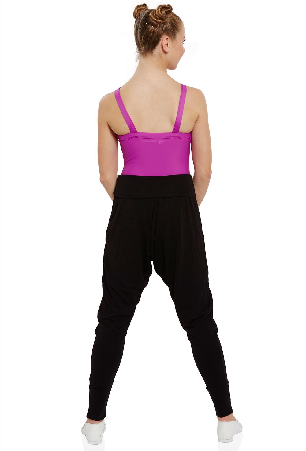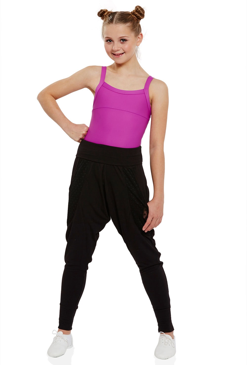 Girls on-trend harem pants with wide fold over waistband and heart mesh side pockets. 47% viscose 47% polyester 6% spandex.