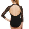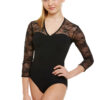 3/4 sleeve leotard with lace upper bodice, sweetheart neckline and wide O-back aperture. Features bra modesty lining. 84% nylon 16% spandex.