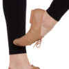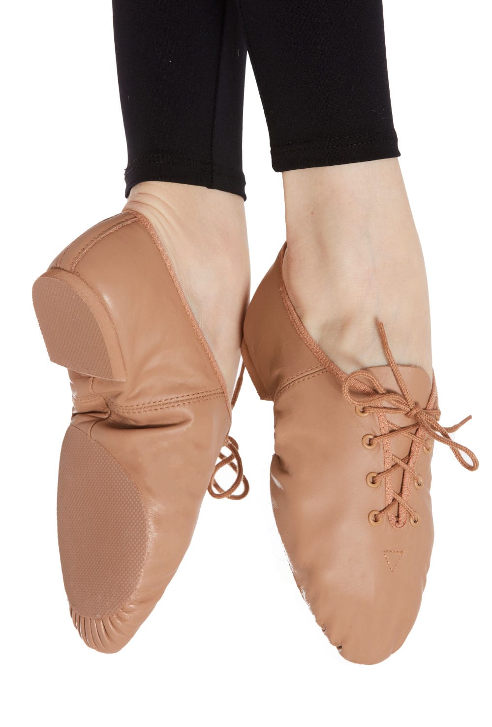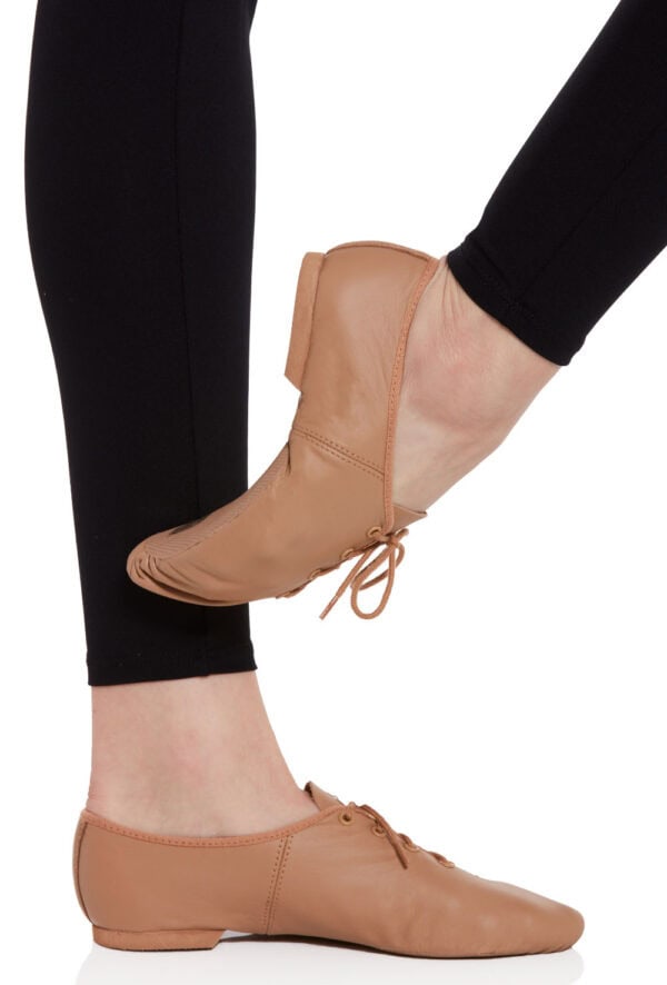 Split sole lace-up jazz shoe with rubber sole. Features leather upper and cotton lining.