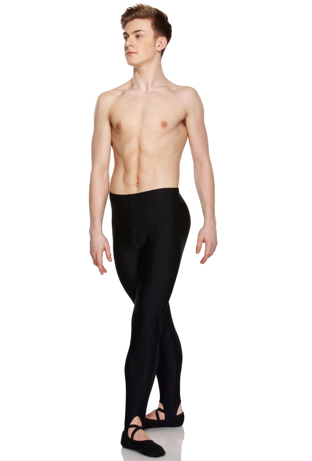 Male sheen finish tights with stitched front seams and gymnastic style deep foot stirrups. 80% polyamide 20% elastane.