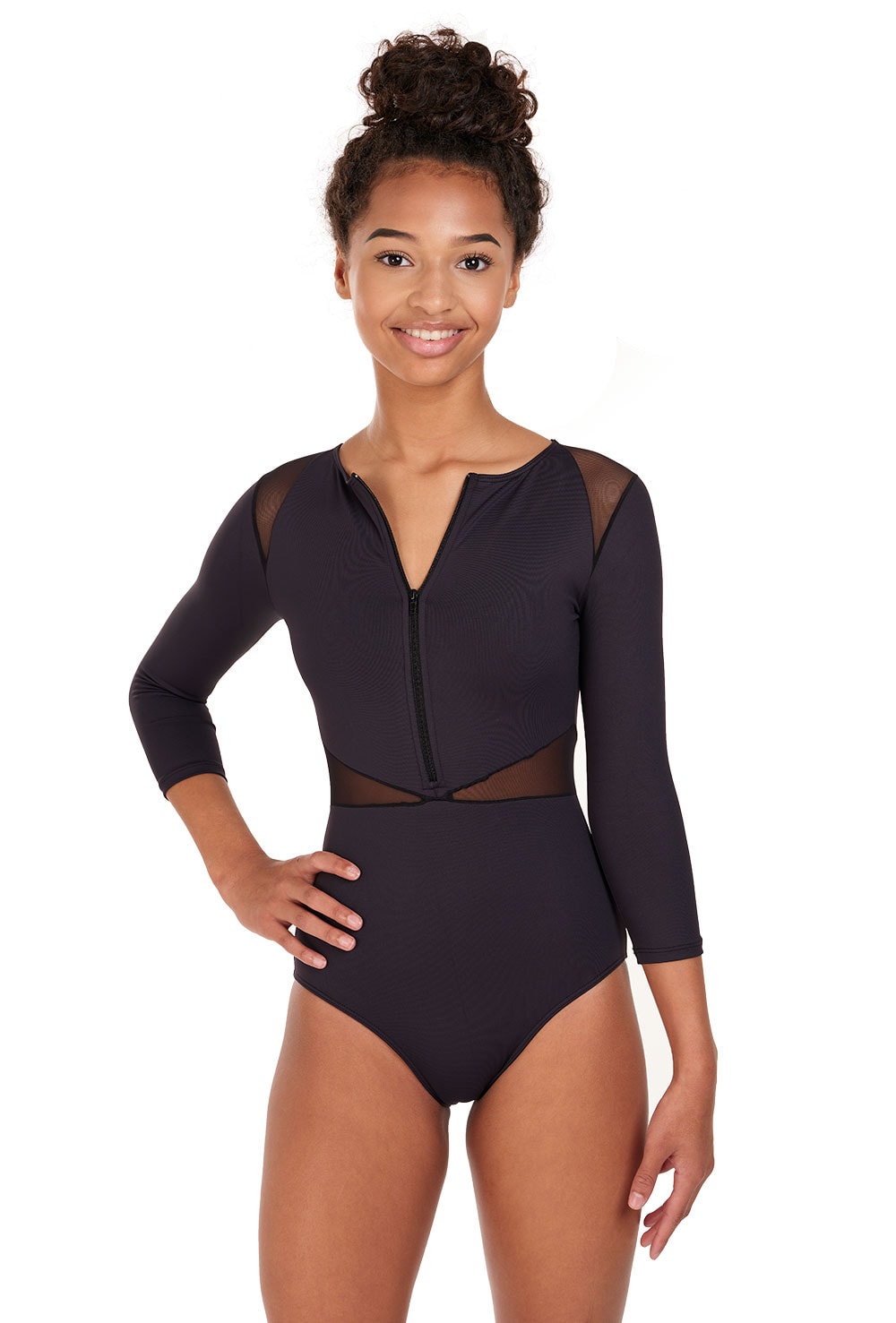 Intermezzo’s zip front 3/4 leotard gives a sporty vibe to a beautiful contemporary leotard