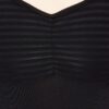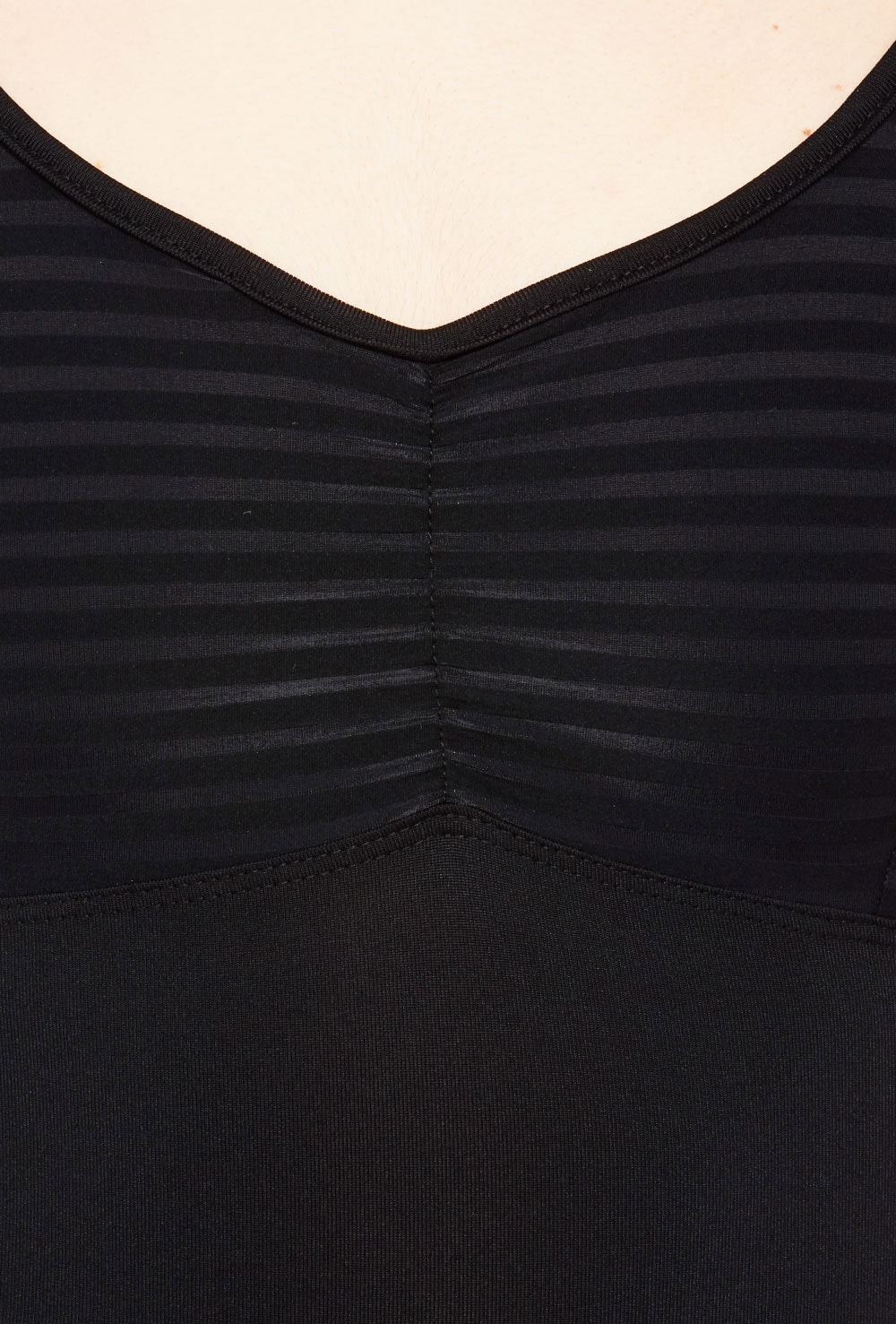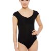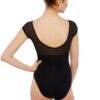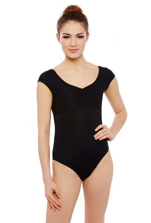 Cap sleeve leotard with sheer mesh stripe back and gathered striped empire bust. Features bra modesty lining. 90% micro nylon 10% lycra.