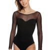 Stunning long sleeve leotard with stretch mesh upper bodice and low plunge back. Features sweetheart neckline. Made in the UK. 80% nylon 20% elastane.