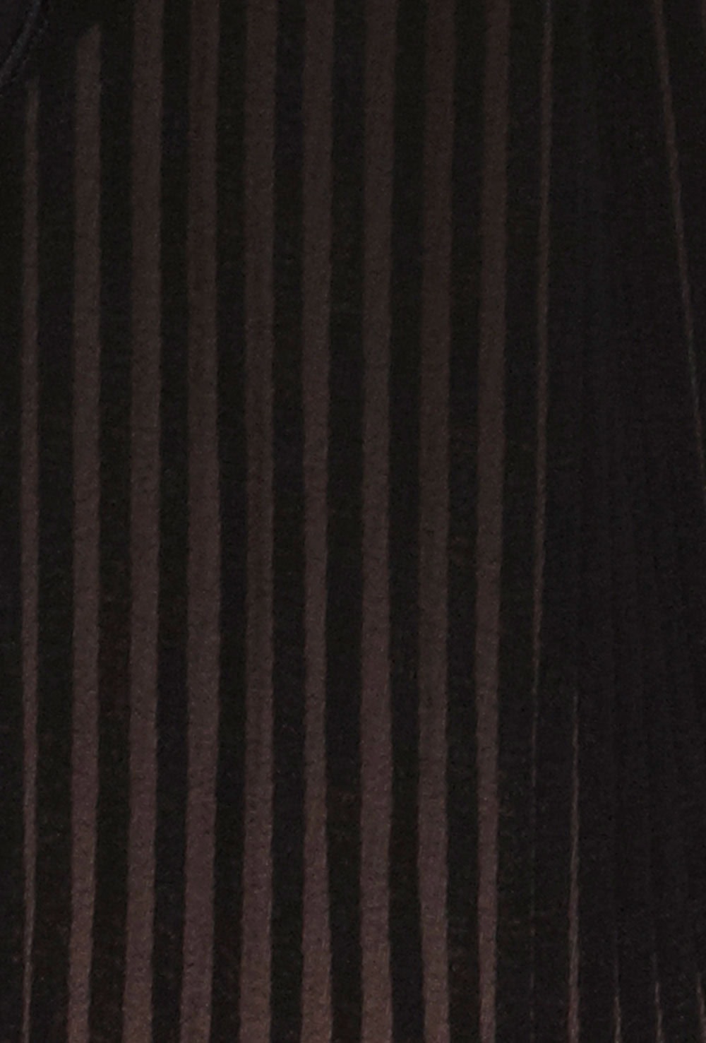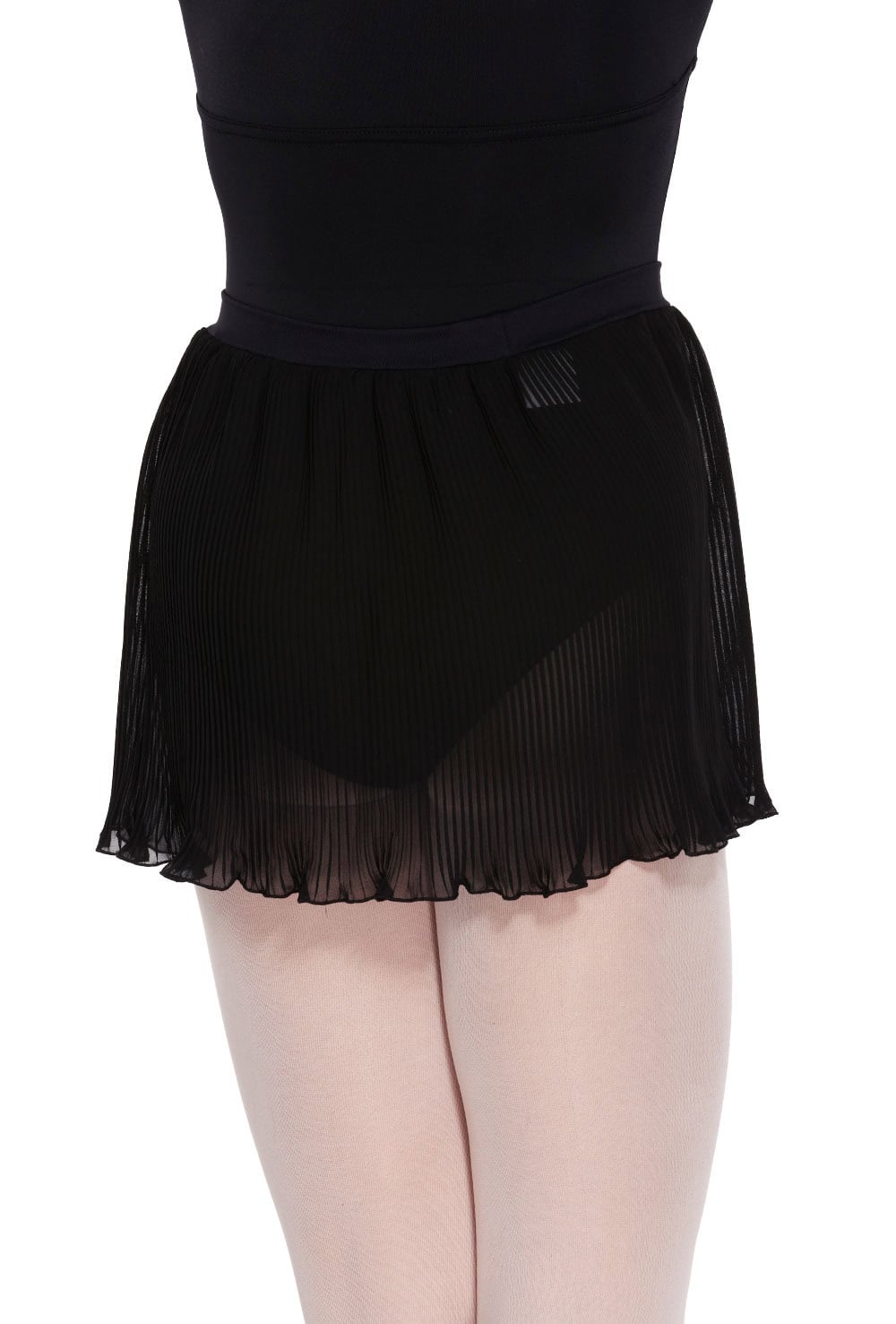 Mock-wrap semi-opaque fine pleated skirt with pull-on stretch waistband. 100% polyester.