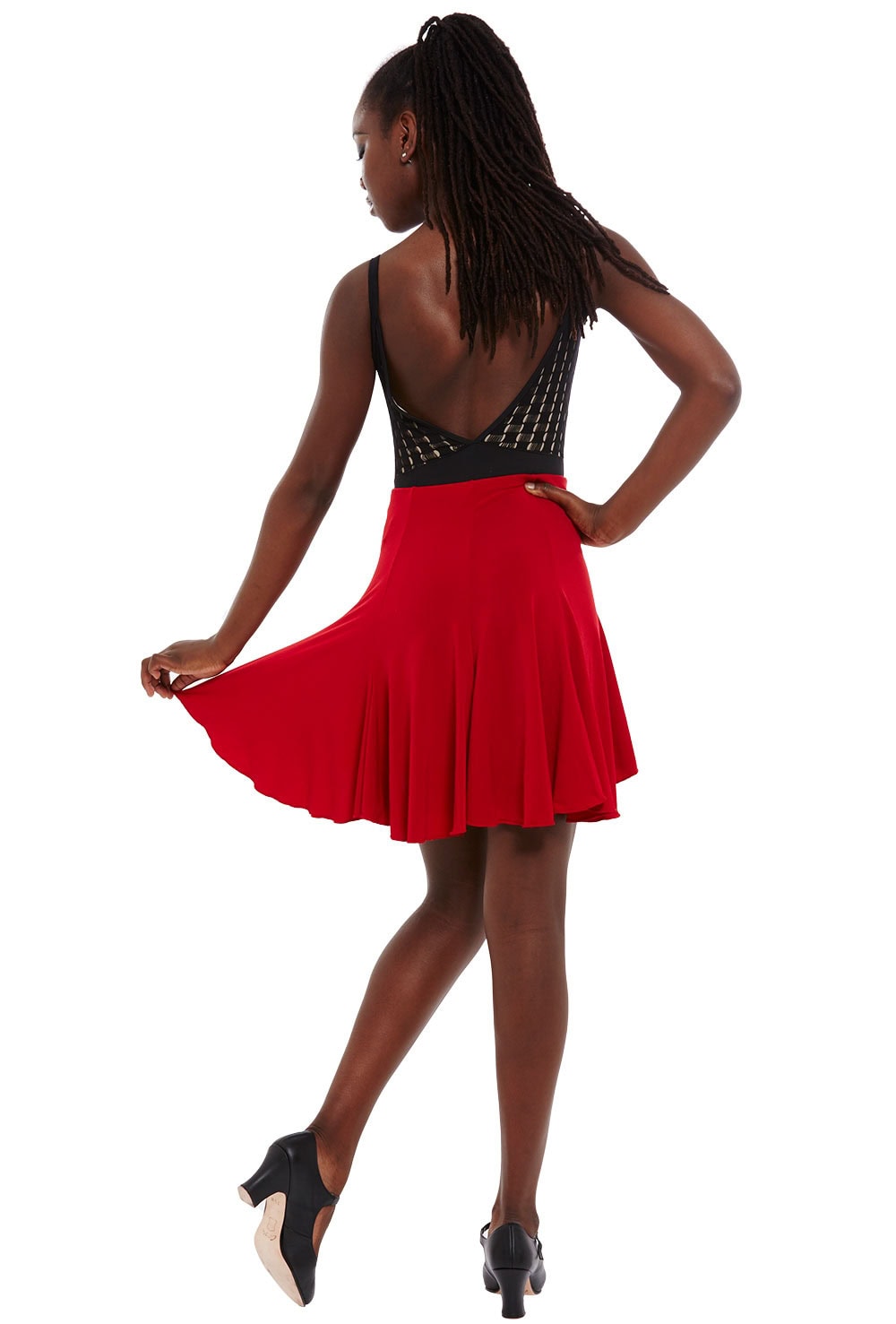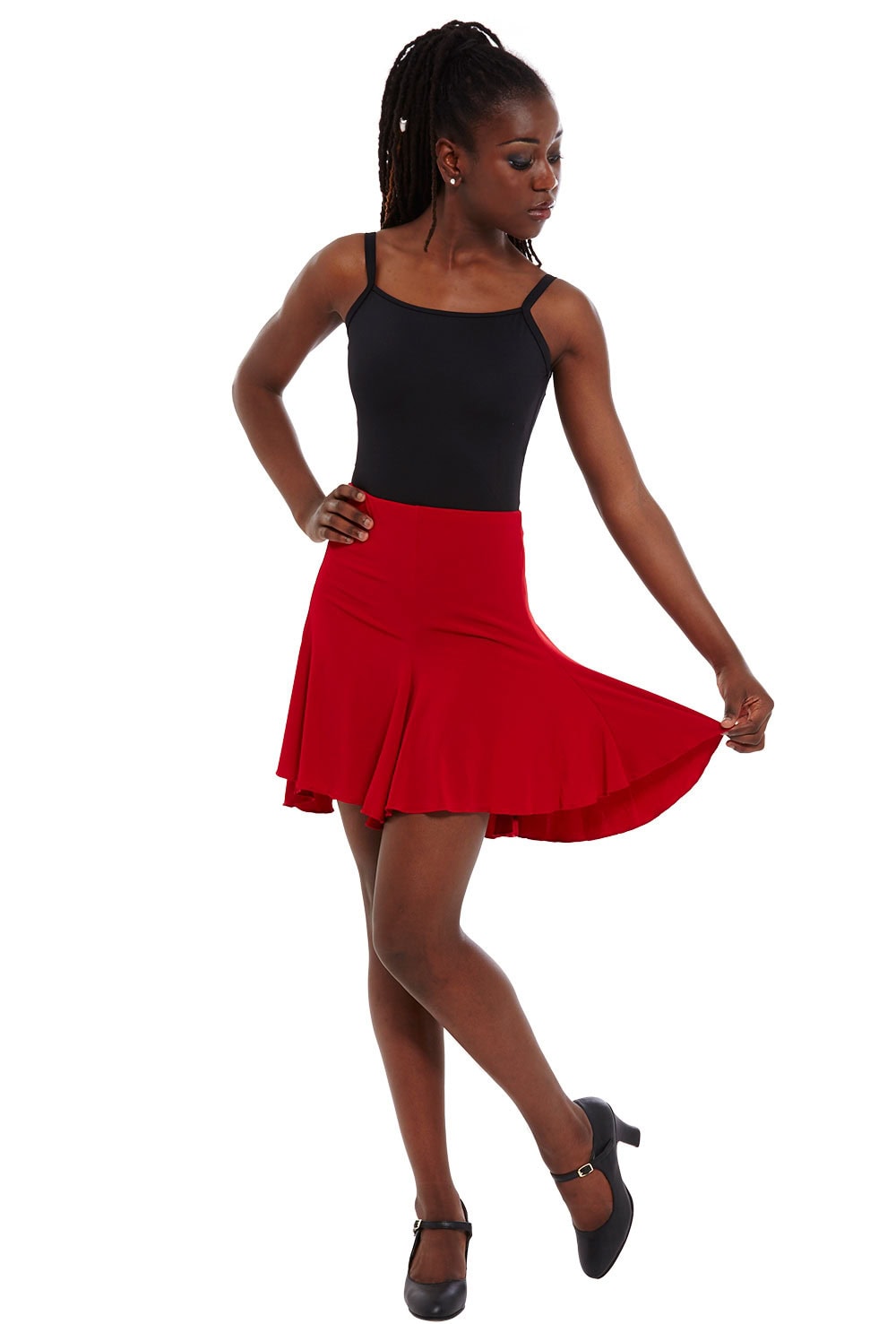 Flare panelled salsa skirt with dropped back hemline. Features pull-on elasticated waistband. 94% polyester 6% spandex.