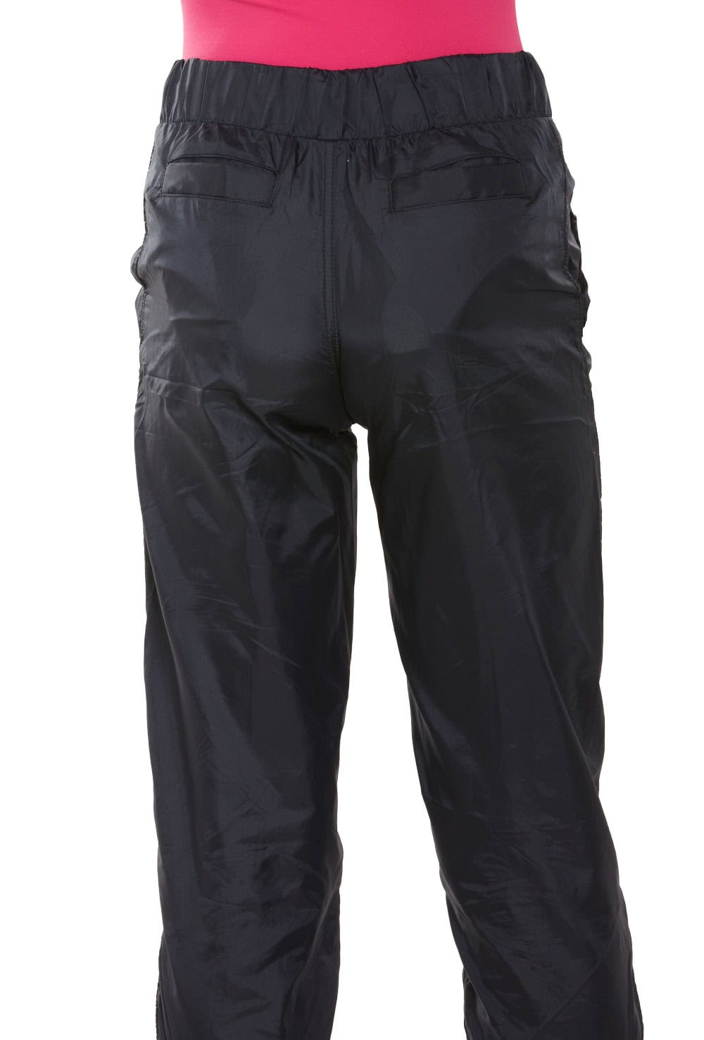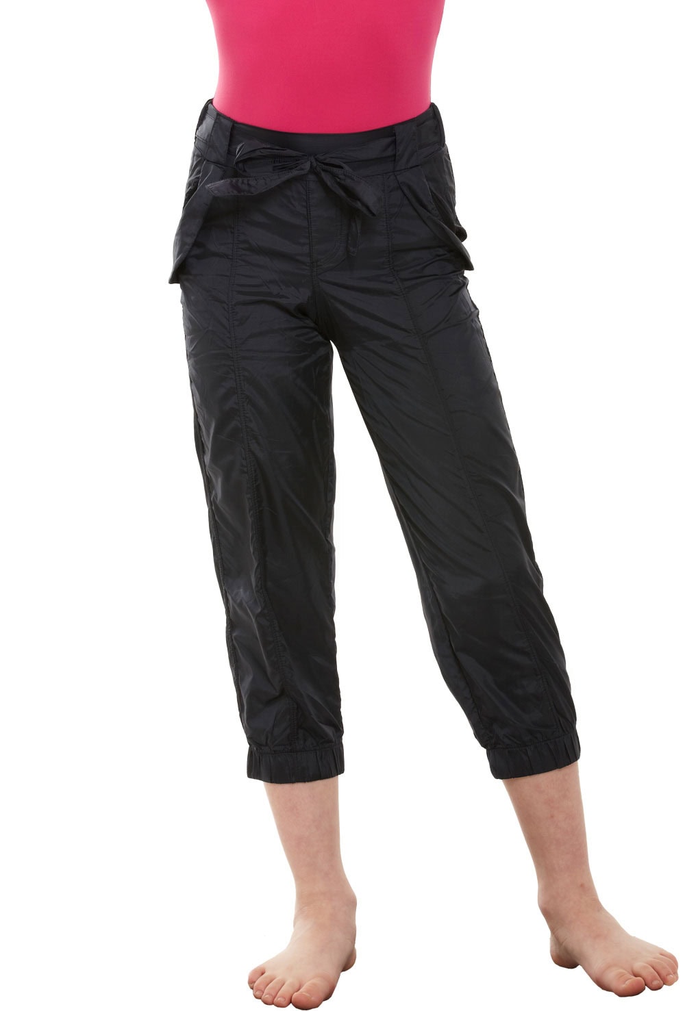 Retro rip stop 3/4 length capri pants with mock tie elasticated waist, elasticated leg cuffs and front and back pocket detail. 100% nylon.