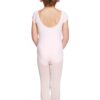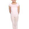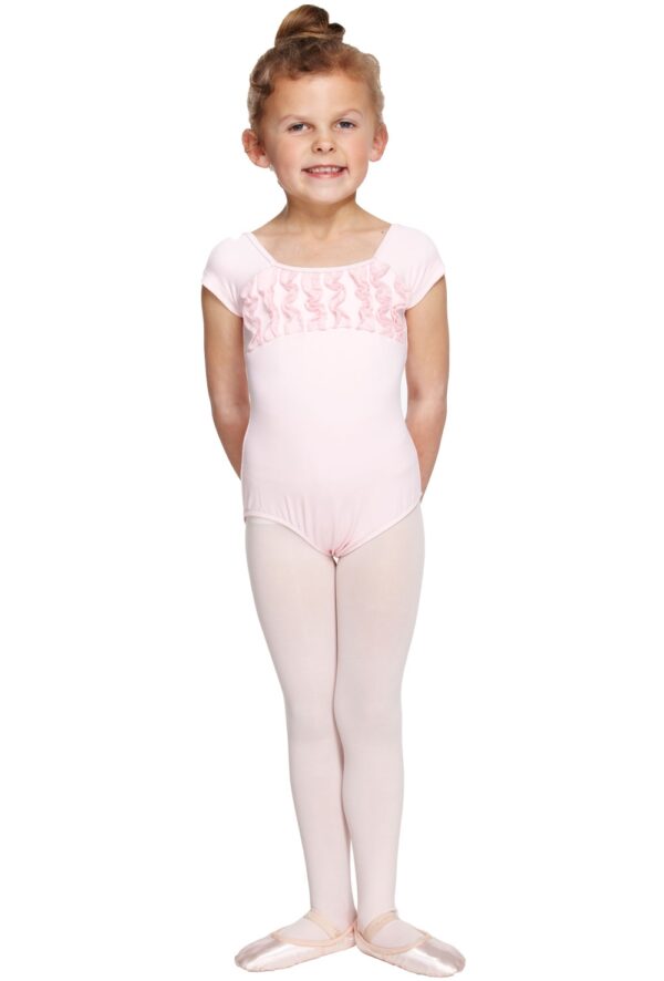 Girls cap sleeve leotard with empire seam and glitter mesh ruffle top. Features full front modesty lining. 90% nylon 10% spandex.