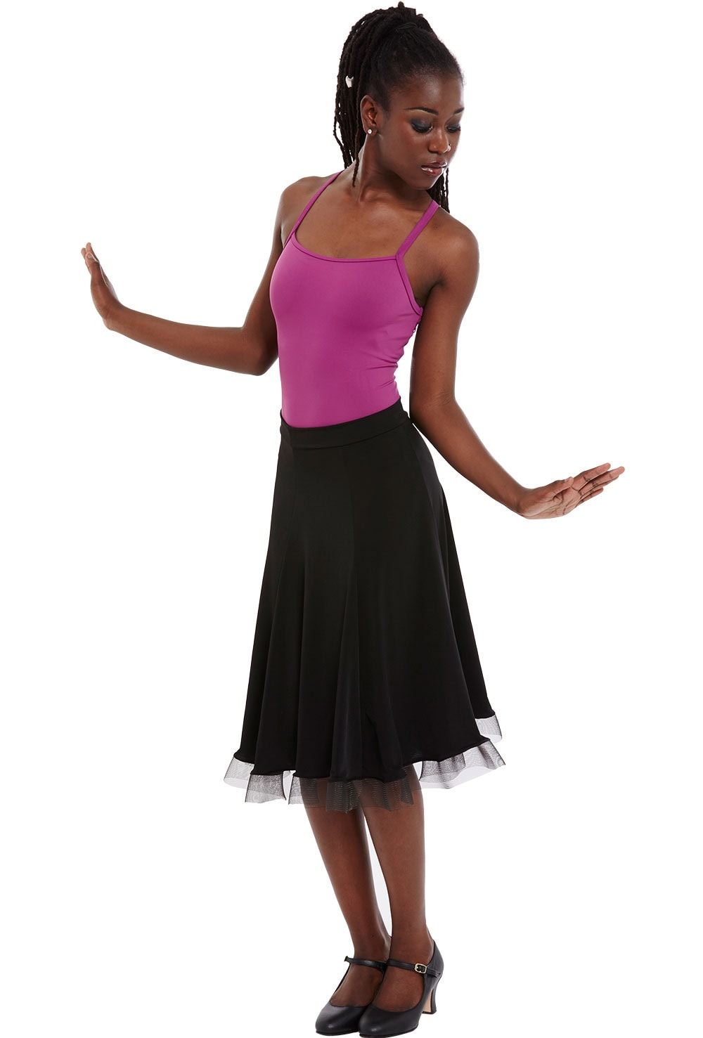 Flare panelled skirt with sheer hem ruffle. Features pull-on elasticated waistband. 94% polyester 6% spandex.