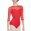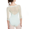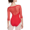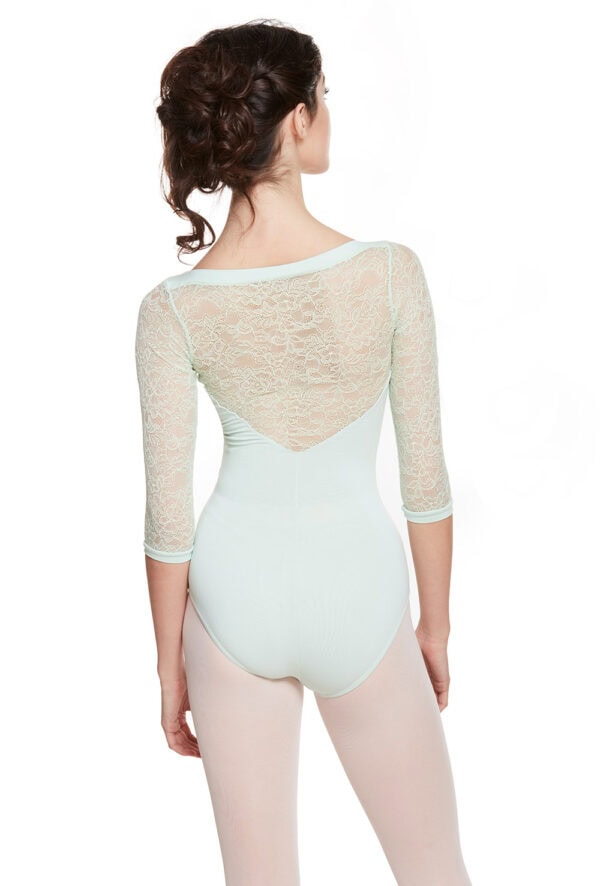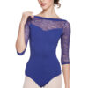 Slash neck leotard with stretch lace upper bodice, low V- back and 3/4 sleeves. Features edged neckline and cuffs and bra modesty lining. 90% polyamide 10% elastane.