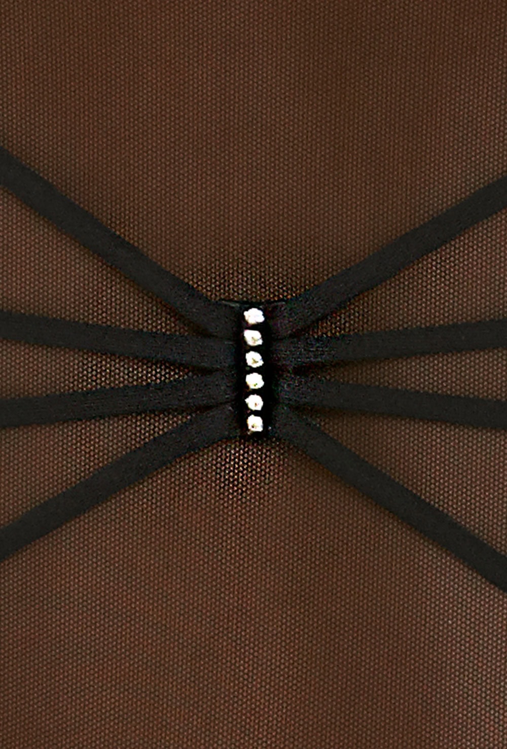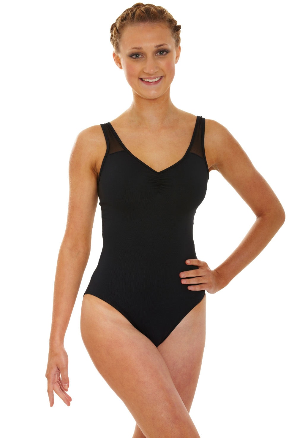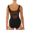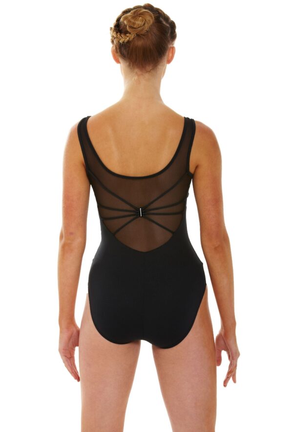Tank leotard with semi opaque mesh shoulder straps and scooped back overlaid with ‘spider’ design accented with diamante embellishment. Features elasticated bust ruche and bra modesty lining. 90% polyamide 10% elastane.