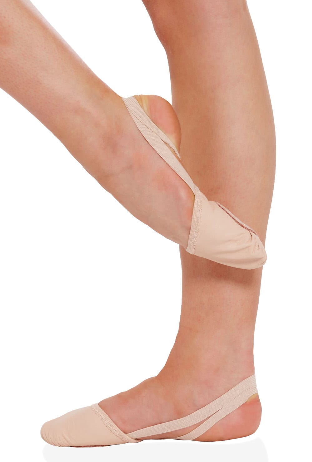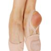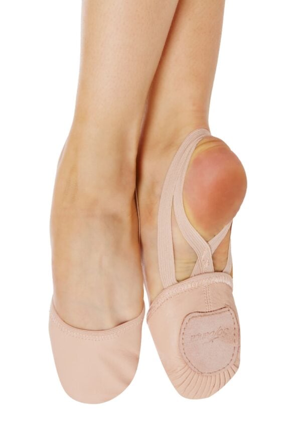Leather gymnastic style dance slipperette with non-slip suede sole patch and soft elastic straps.