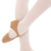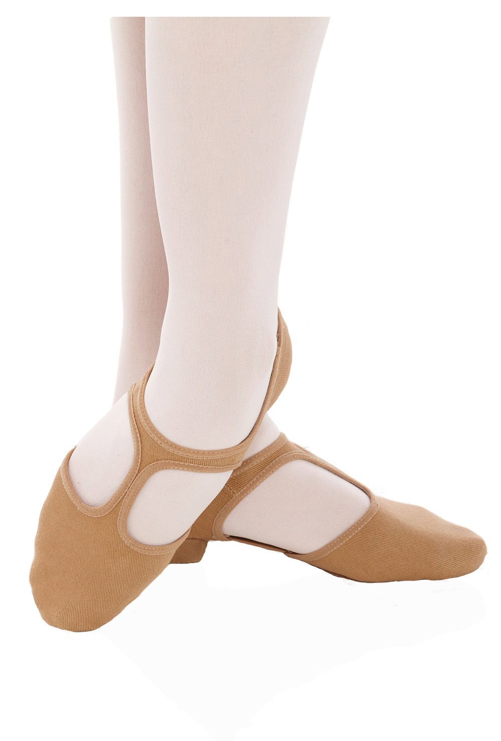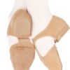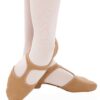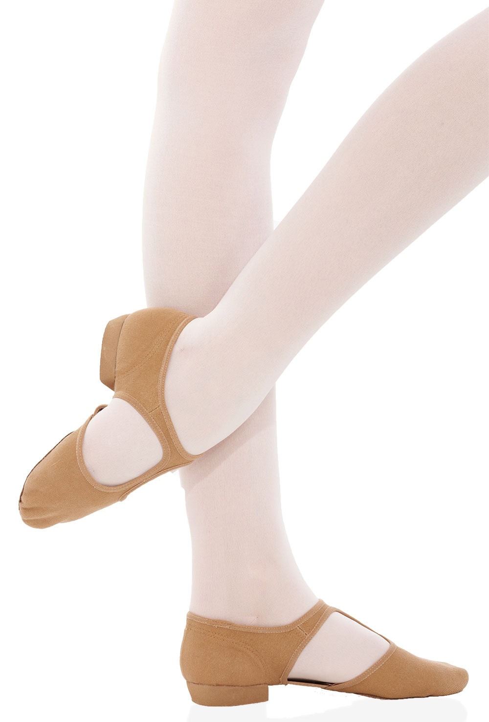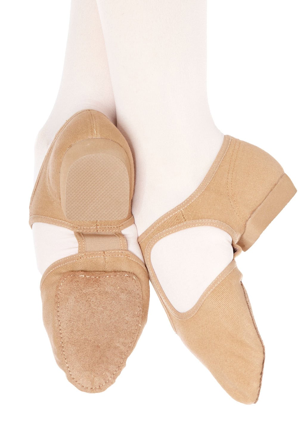 Stretch canvas grecian style teaching sandal with T-bar and low heel. Features under arch elasticated strip and split sole with contoured front suede patch and rubber heel.