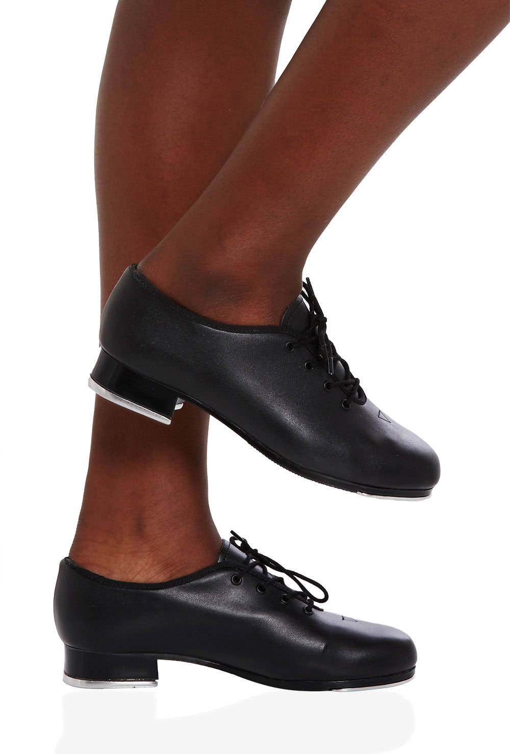 Value jazz tap shoe with matte synthetic leather upper and rubber sole. Features padded insole and comfort lining. Comes complete with toe and heel Techno tap plates shaped for maximum floor contact and sound.