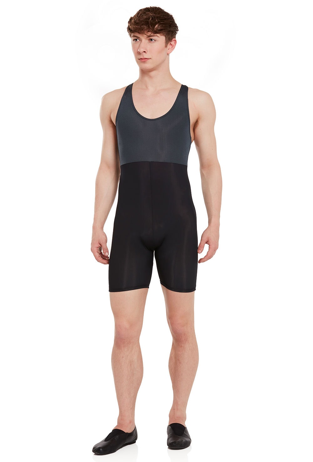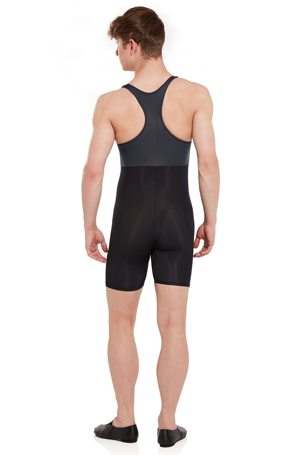 Men’s colour two-tone block short unitard with racer back. 80% nylon 20% lycra elastane.