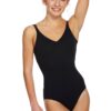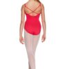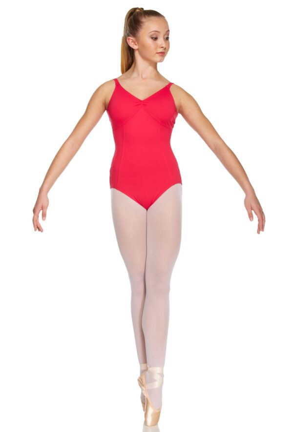 Twin strap camisole leotard with contouring front seams, gathered empire bust and X-back detail. Features full front lining.
