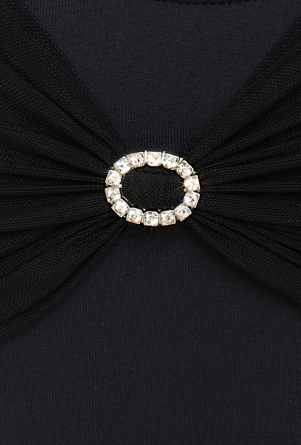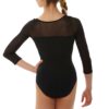 Elegant matte-finish leotard with mesh 3/4 sleeves, upper back and gathered bust overlay with an oval diamante “brooch” detail. Features full front modesty lining. 92% polymeryl 8% elastane.
