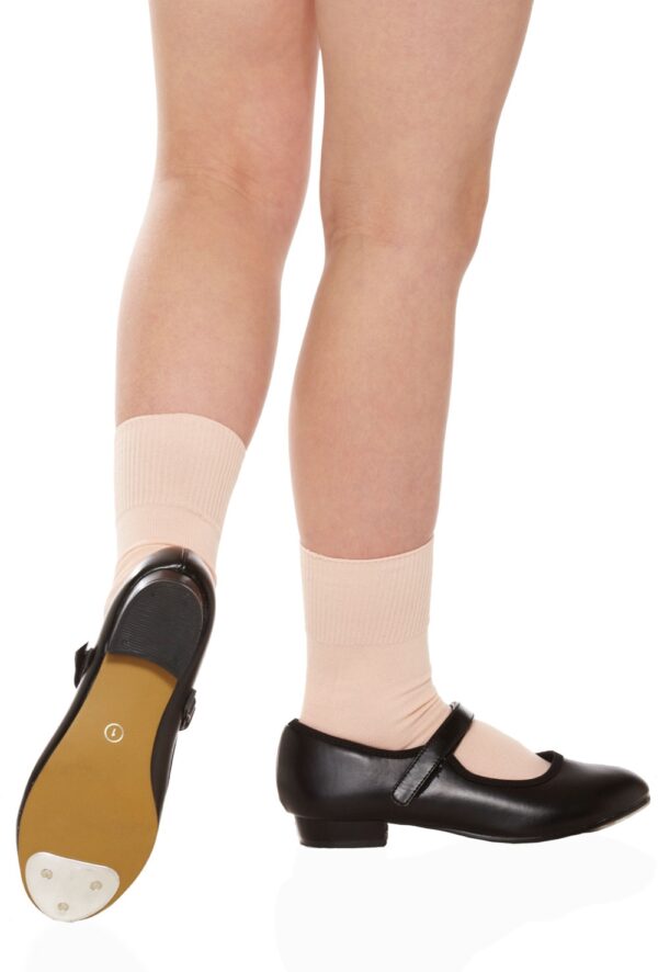Children’s Mary Jane style tap shoe with velcro strap fastening. Features PU upper and comes complete with front toe tap. AJK heel taps are sold separately. Tap shoe sizes 10-12 require 1 1/2 inch heel tap. Tap shoe sizes 13-1 require 1 3/4 inch heel tap.
