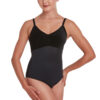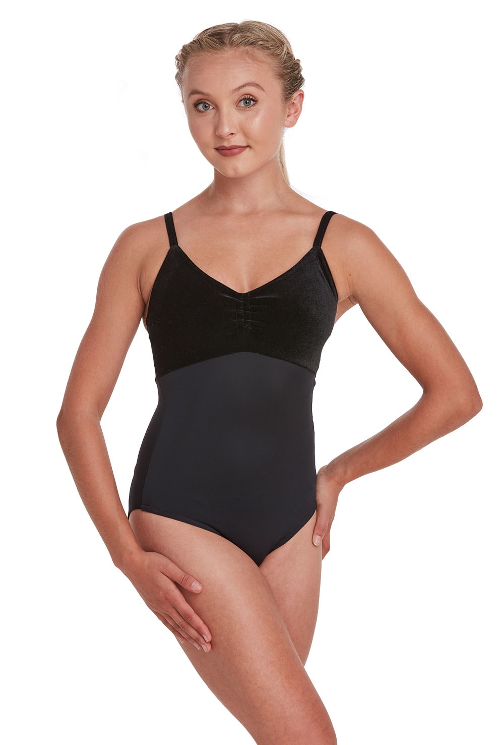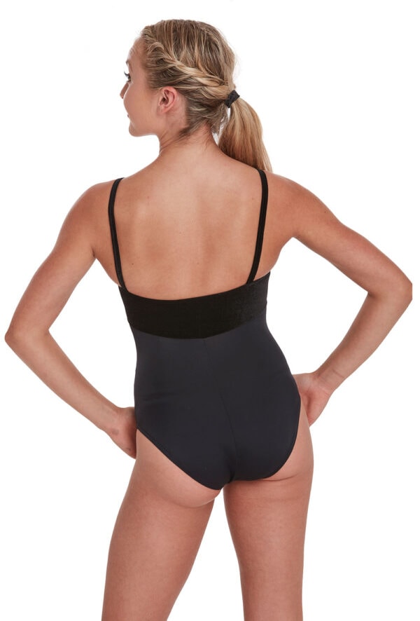 Classic camisole leotard with velour bust and lycra bodice. Features drawstring ruche. 81% nylon 19% elastane lycra.
